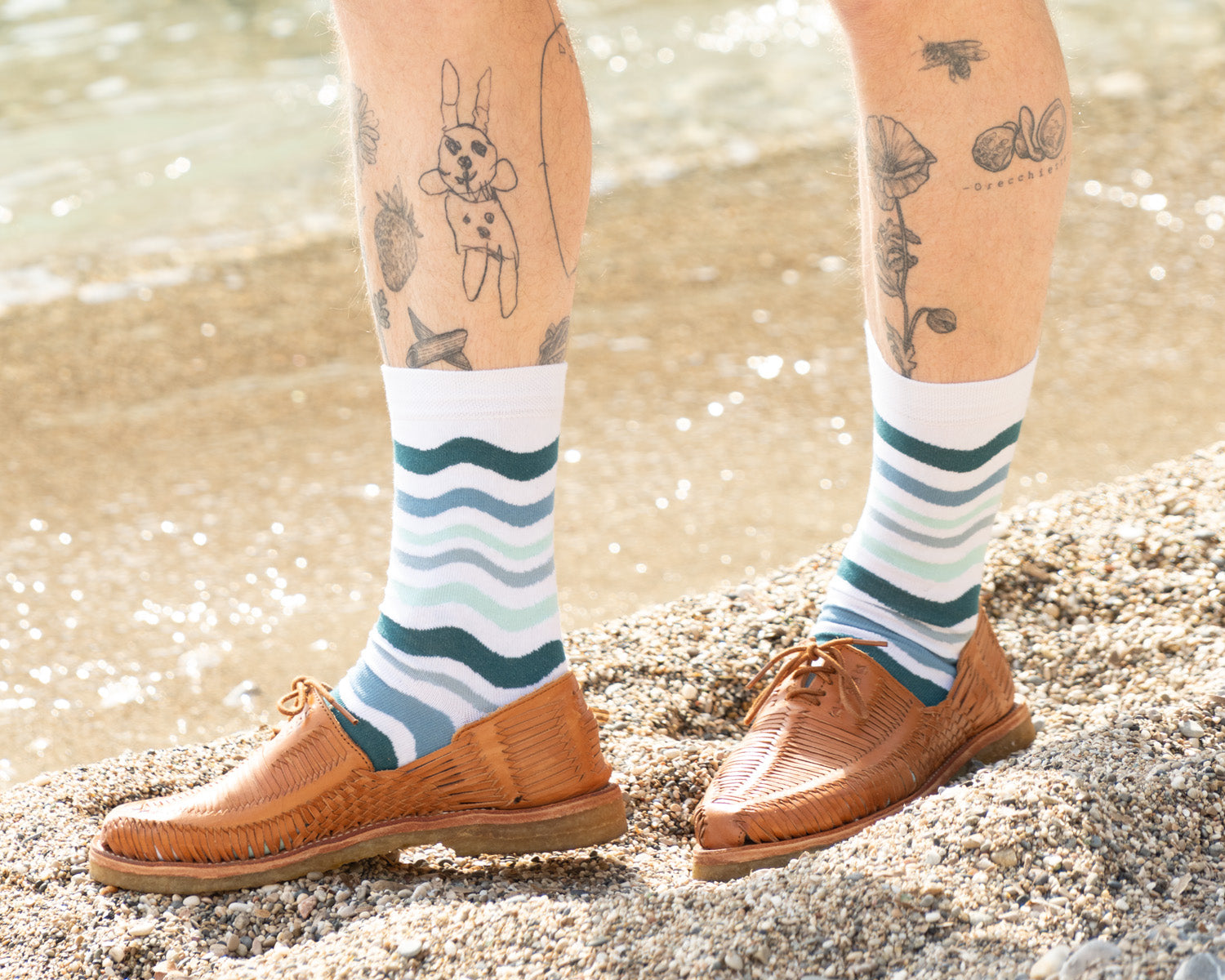 Die Socke ONDA bringt die Bewegung des Meeres direkt in dein Outfit. Auf dem klaren weissen Grund ziehen sich feine Wellenlinien in verschiedenen Blau- und Türkistönen über die Socke – inspiriert vom rhythmischen Spiel der Wellen des Mittelmeers.