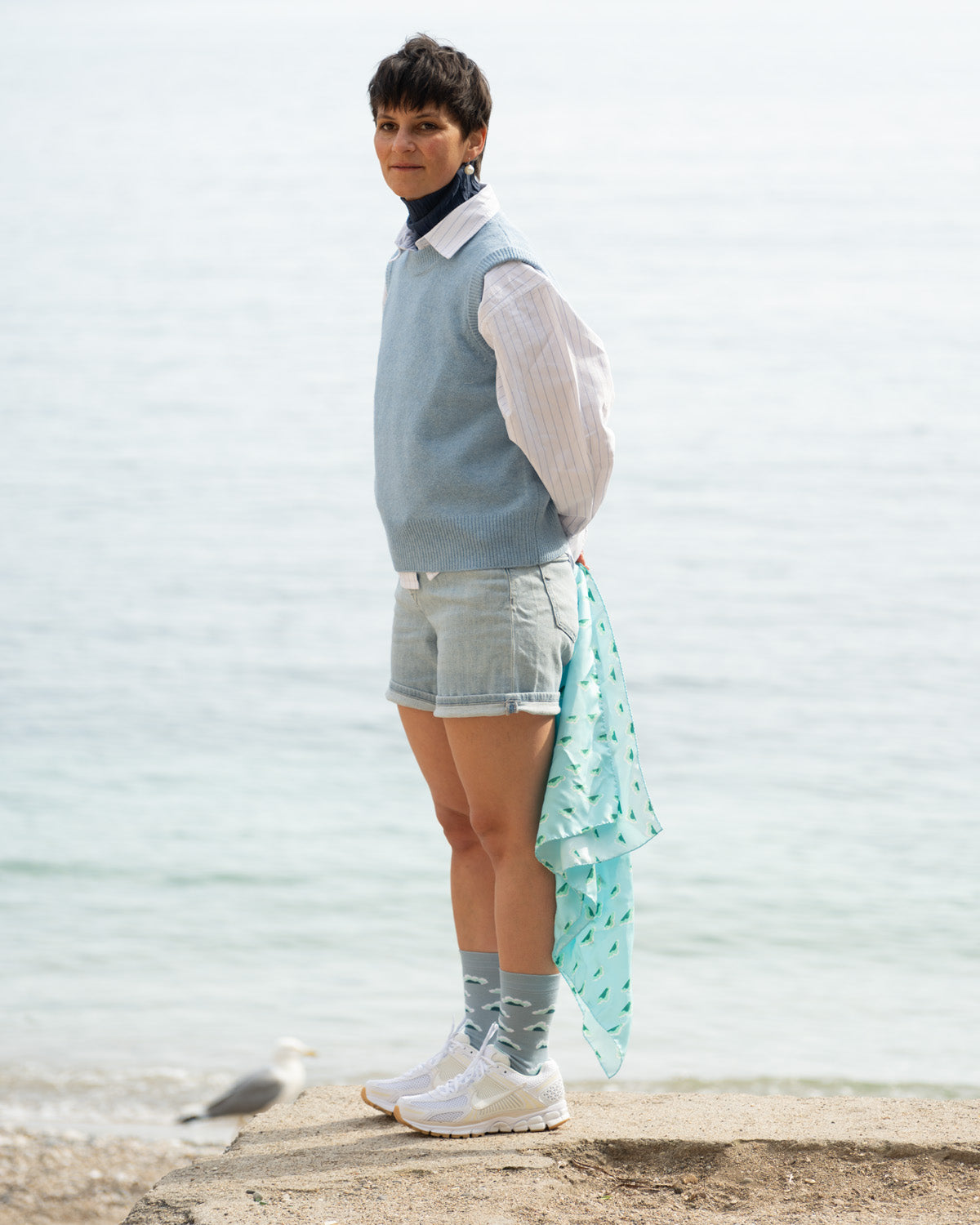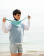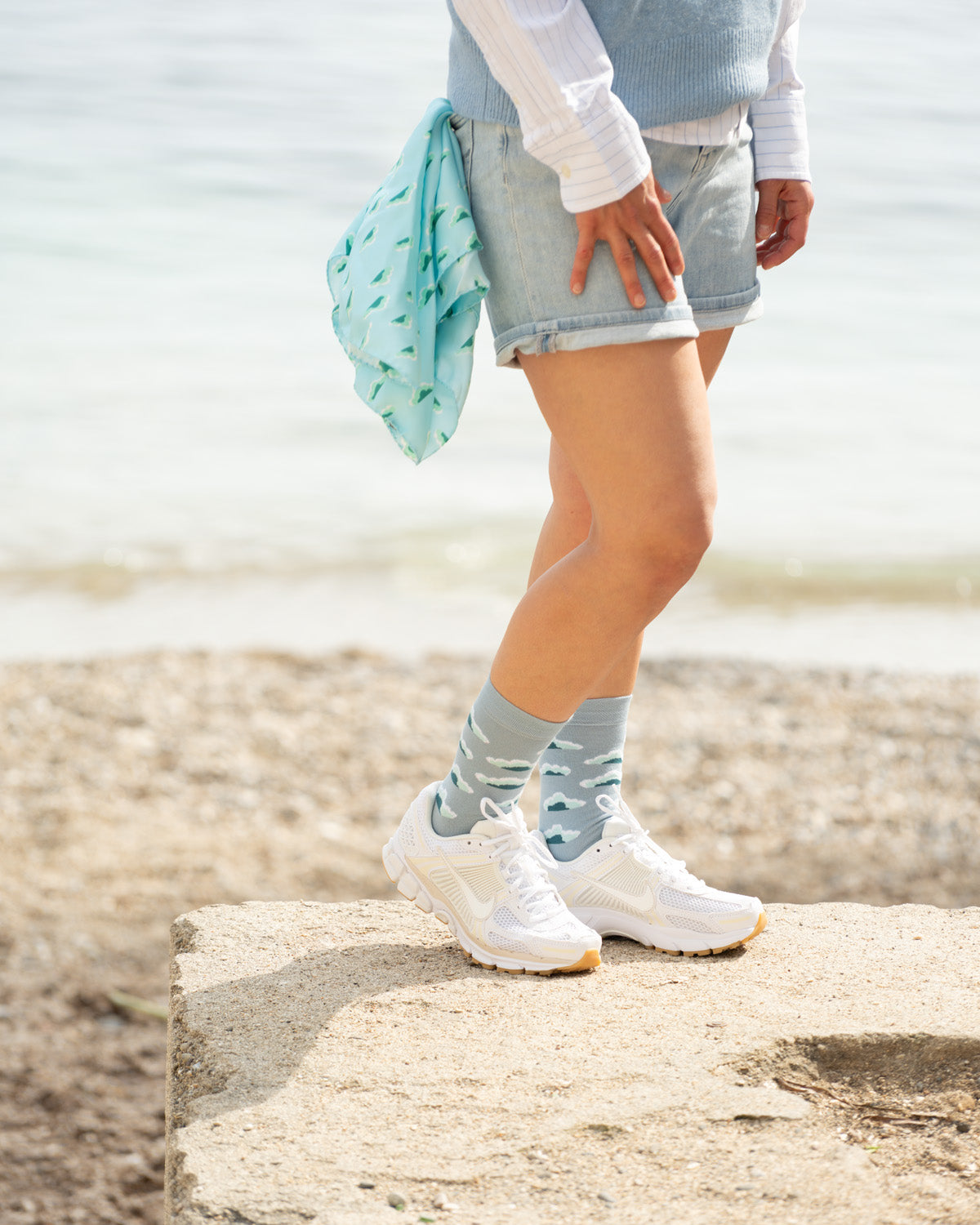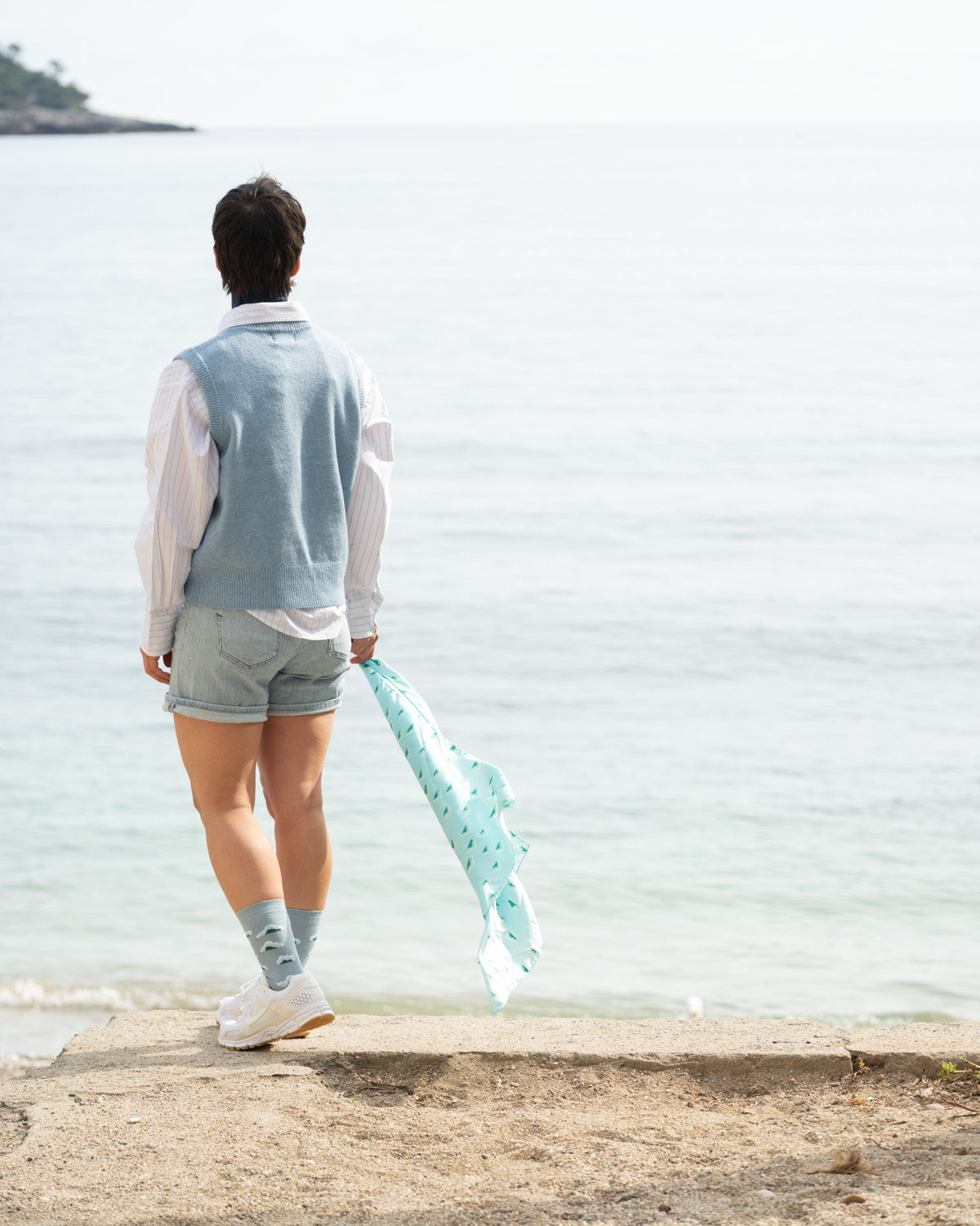 Das Motiv greift die Idee der gleichnamigen Socke auf und übersetzt sie in eine luftige, fliessende Bewegung. Locker in der Hand getragen, um den Hals gelegt oder vom Wind getragen, begleitet NUVOLA dich wie eine leichte Brise am Strand.