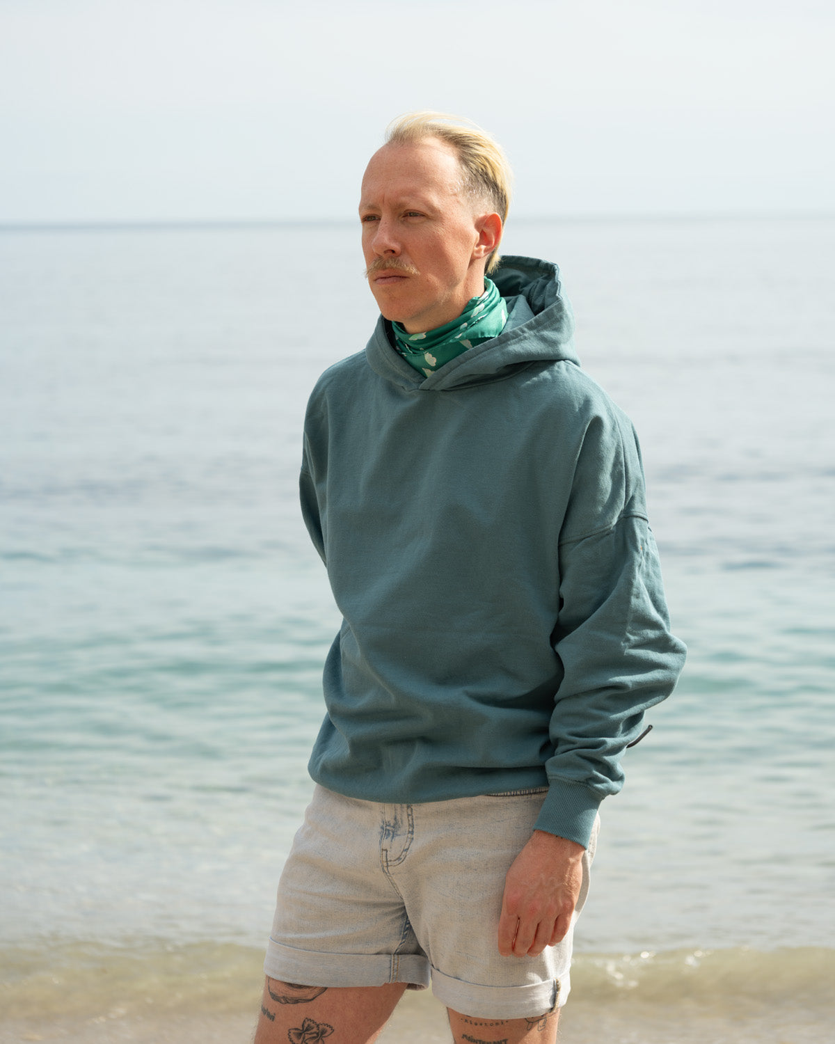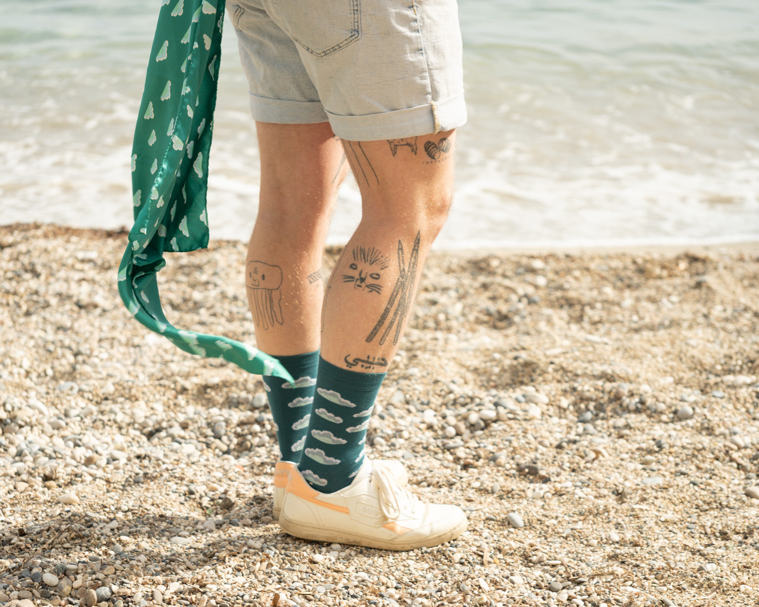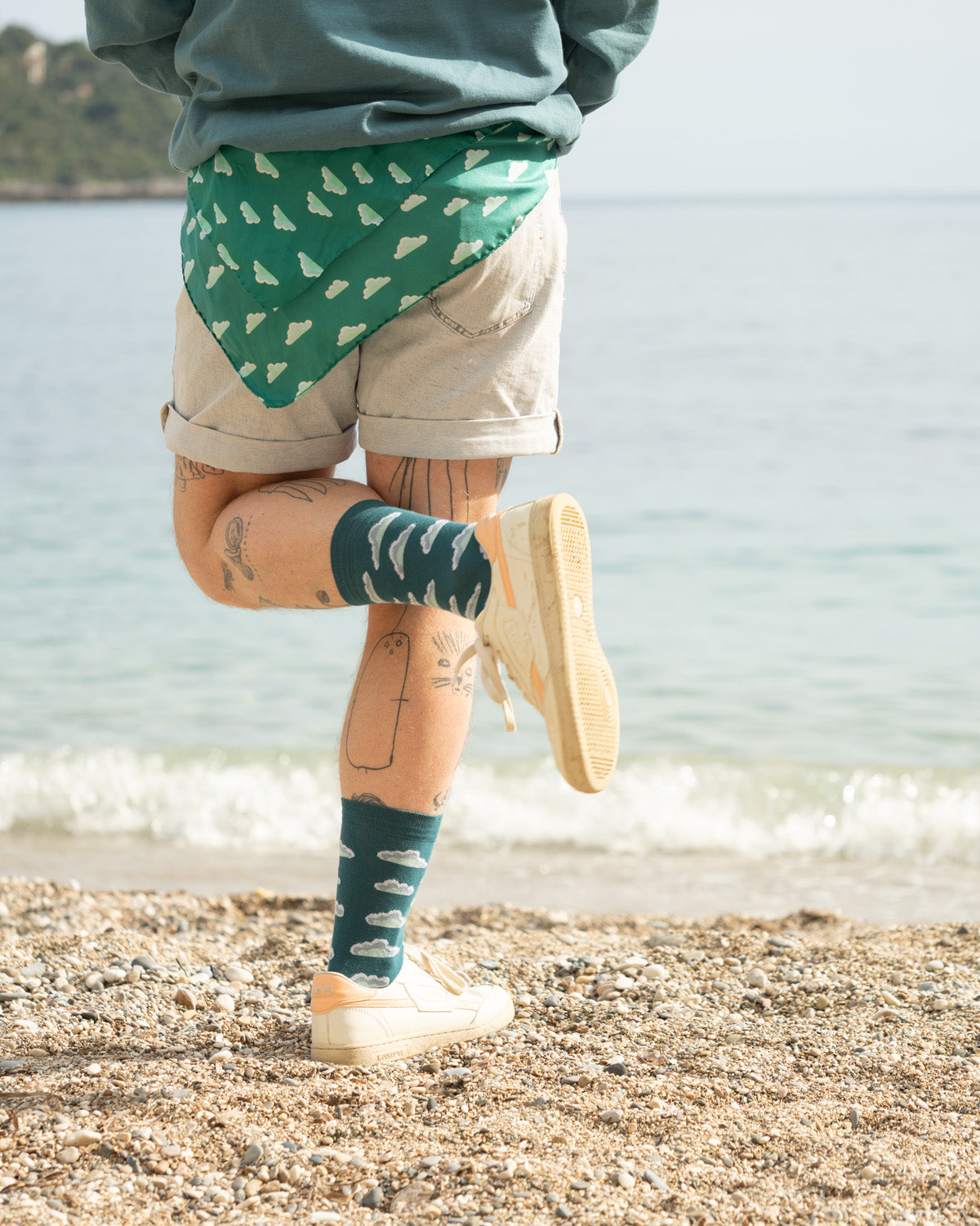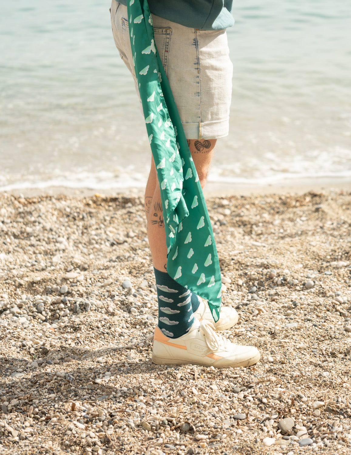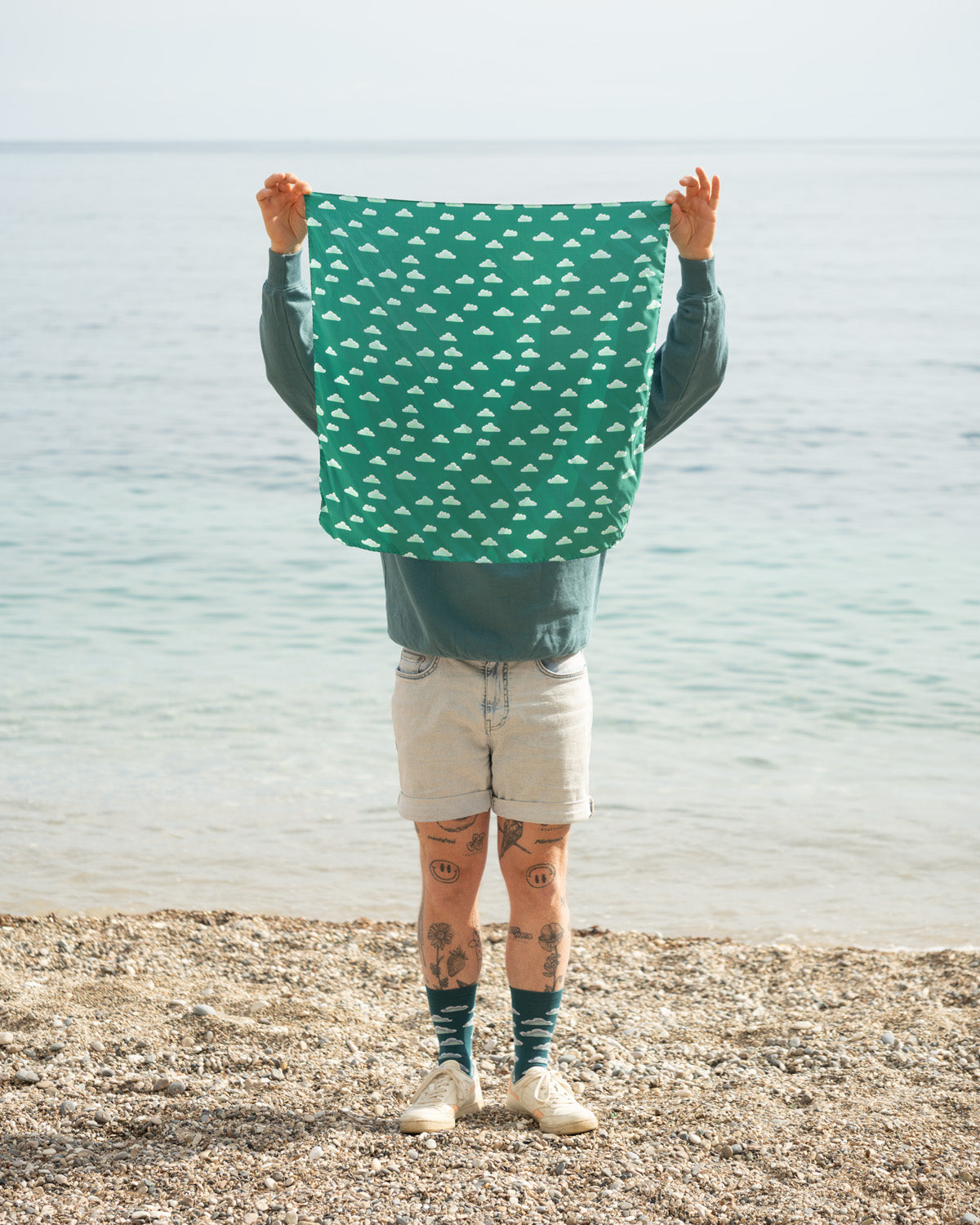Das gleichmässige Wolkenmotiv wirkt ruhig, klar und zeitlos. Es greift die Idee der Socke PIANA auf und übersetzt sie in ein leichtes, fliessendes Accessoire, das sich sanft bewegt – ob locker um den Hals gelegt, über die Schultern getragen oder einfach vom Wind getragen.