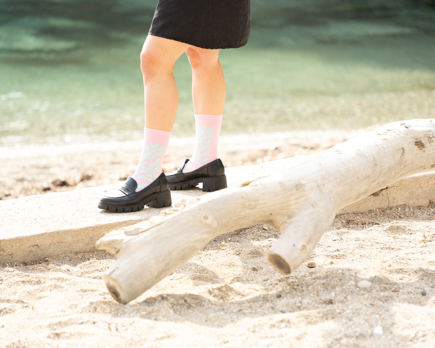 Die Socke KORALIE zeigt eine besonders sanfte Seite der Sky & Sea Kollektion. Auf einem zarten rosafarbenen Grund schlängelt sich eine mintgrüne Koralle elegant um dein Bein und erinnert an die ruhige, faszinierende Welt unter der Wasseroberfläche.