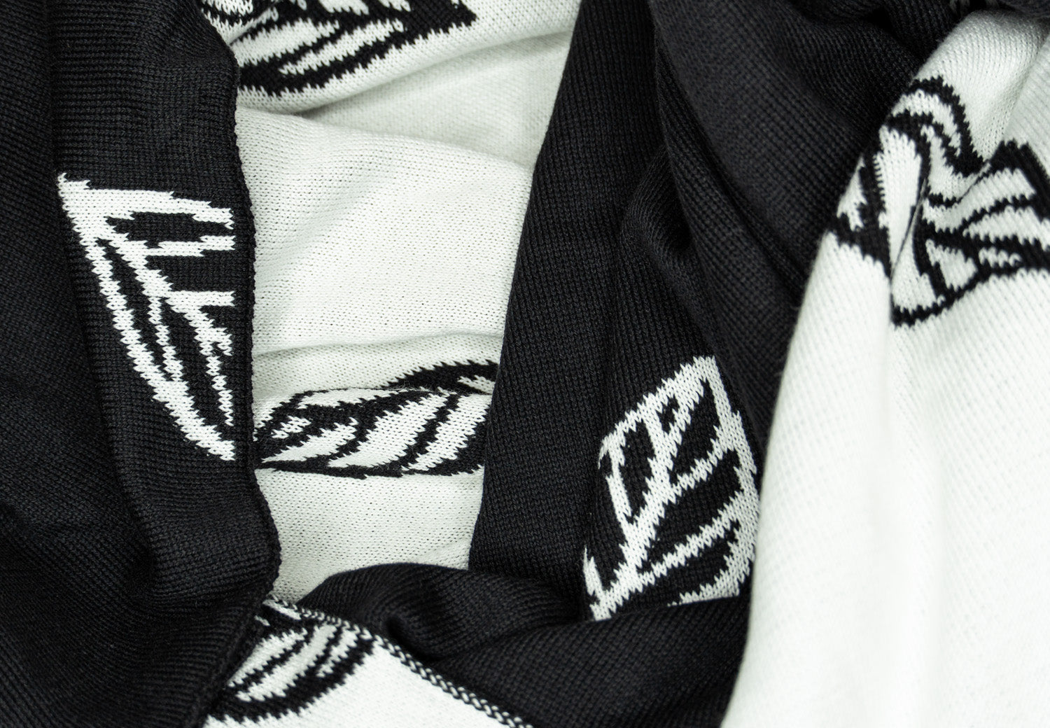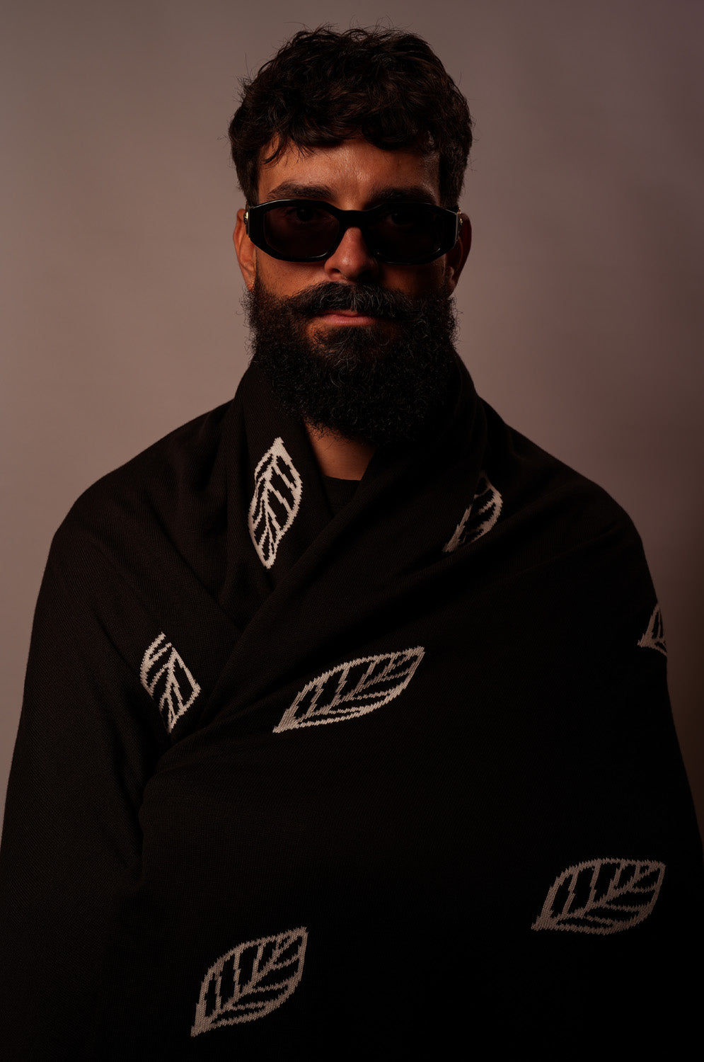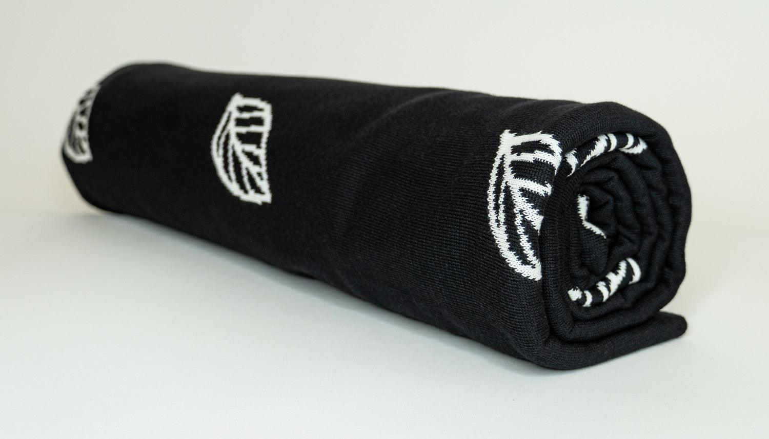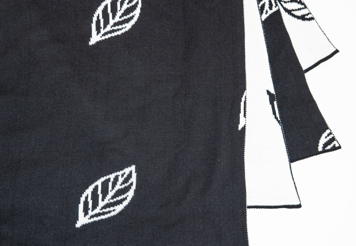Die Lapa Decke ist die hochwertige Ergänzung zu den beliebten Lapa Sportsocken – zwei Strickprodukte, ein Design, eine Haltung. Das markante Blattmotiv steht für Lebendigkeit und Bewegung, für Ruhe und Stärke zugleich. Auf der einen Seite erscheinen die Blätter in Weiss auf schwarzem Grund, auf der anderen Seite in Schwarz auf Weiss – ein Spiel von Kontrast und Balance.