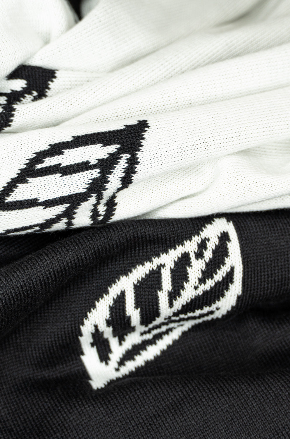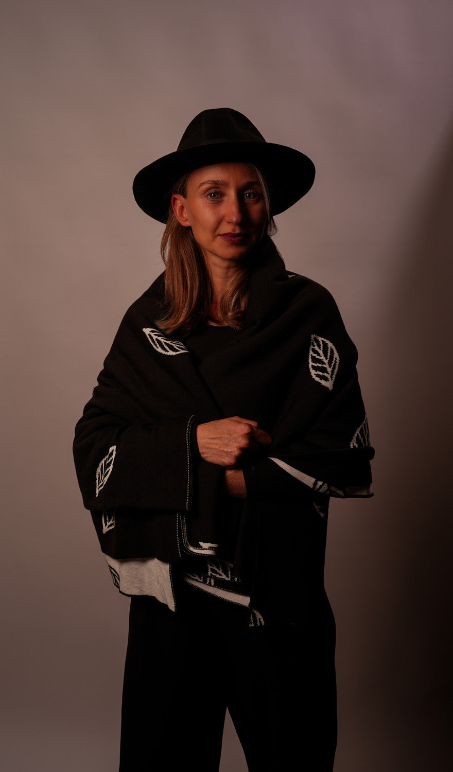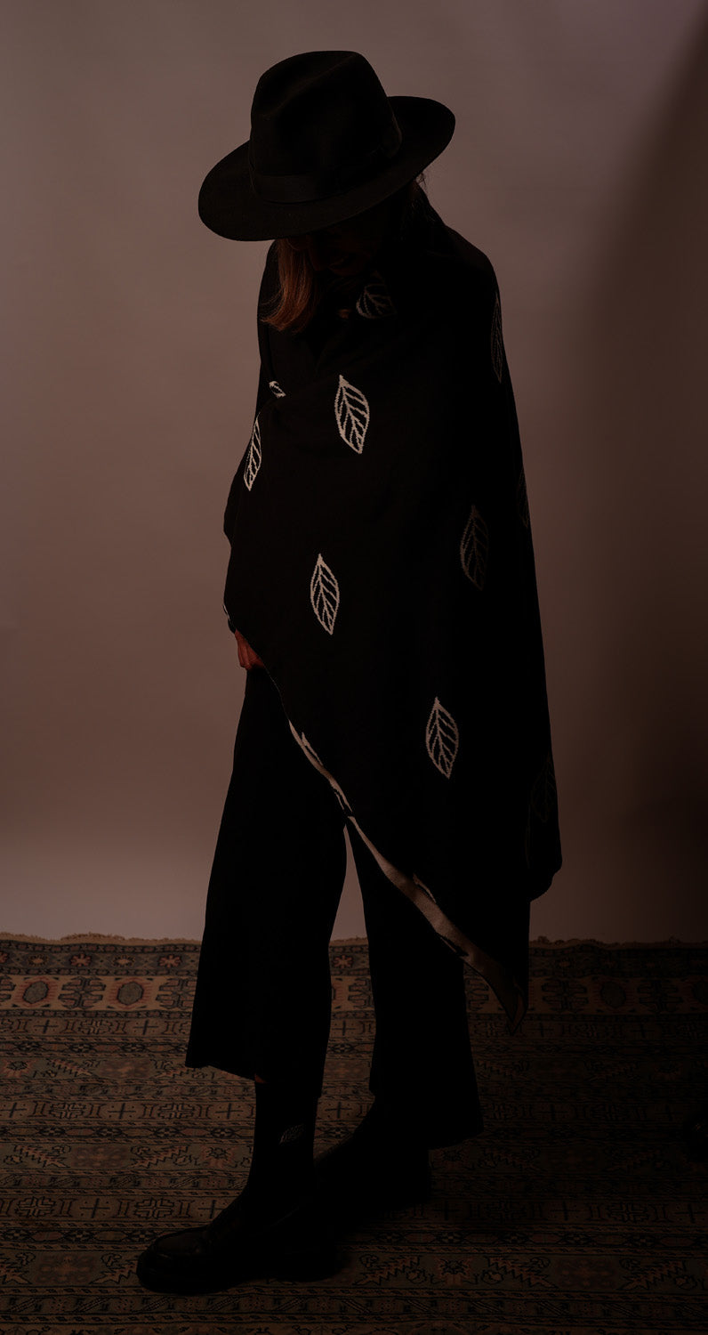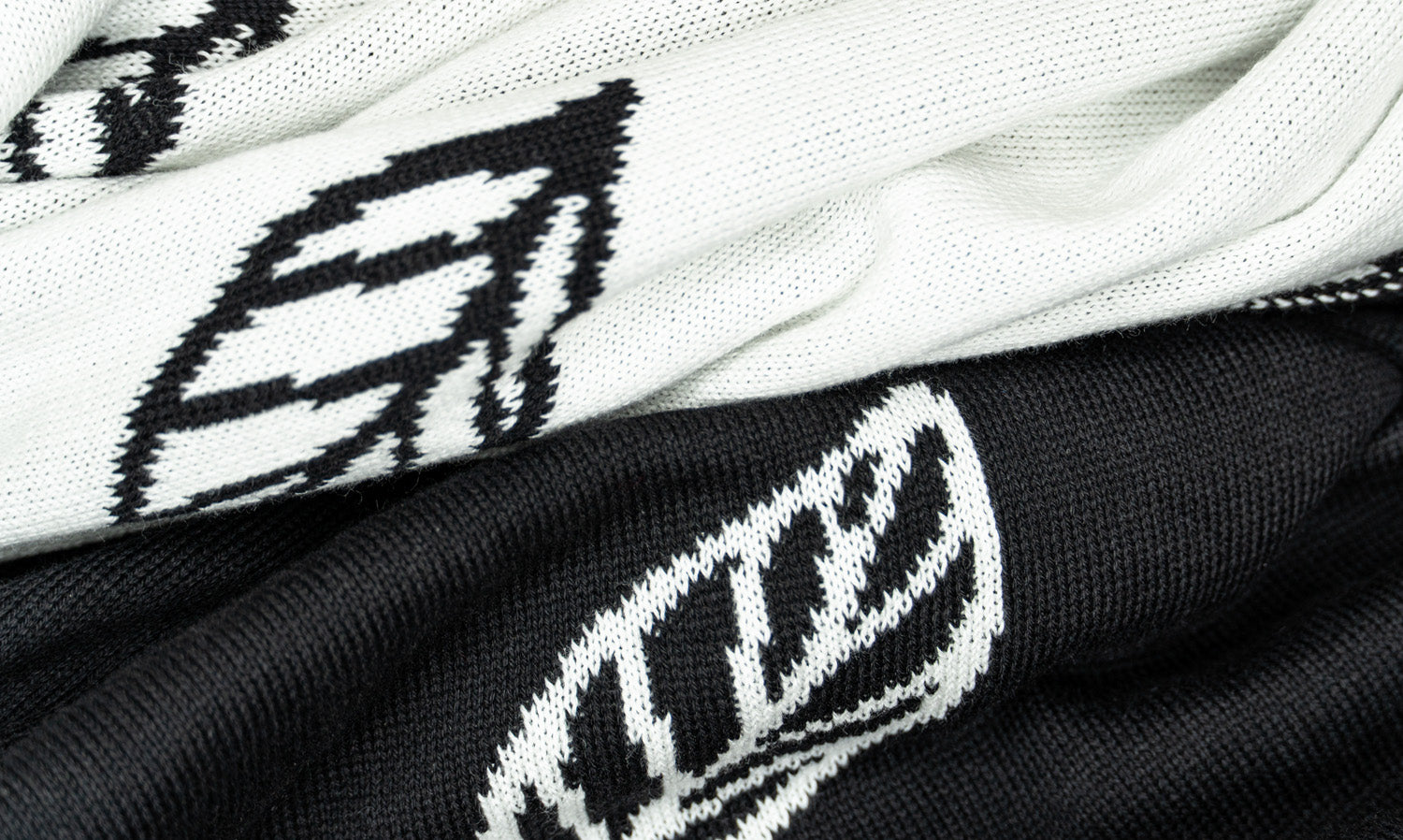Die Lapa Decke ist die hochwertige Ergänzung zu den beliebten Lapa Sportsocken – zwei Strickprodukte, ein Design, eine Haltung. Das markante Blattmotiv steht für Lebendigkeit und Bewegung, für Ruhe und Stärke zugleich. Auf der einen Seite erscheinen die Blätter in Weiss auf schwarzem Grund, auf der anderen Seite in Schwarz auf Weiss – ein Spiel von Kontrast und Balance.