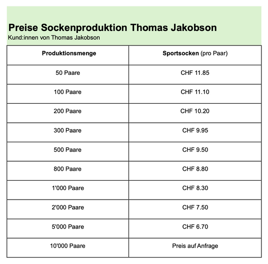 Die Preise sind abhängig von der Bestellmenge, da wir mit Staffelpreisen arbeiten. Je mehr Paare du bestellst, desto günstiger wird der Preis pro Paar. So kostet ein Paar bei einer Bestellung von 50 Paaren CHF 11.85, bei einer Bestellung von 500 Paaren aber nur noch CHF 9.50.